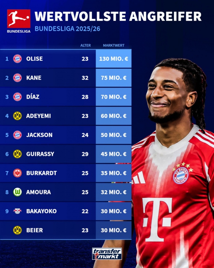 德甲進攻球員身價排行:奧利塞1.3億歐居首,凱恩7500萬歐次之