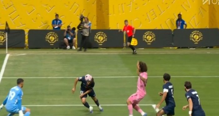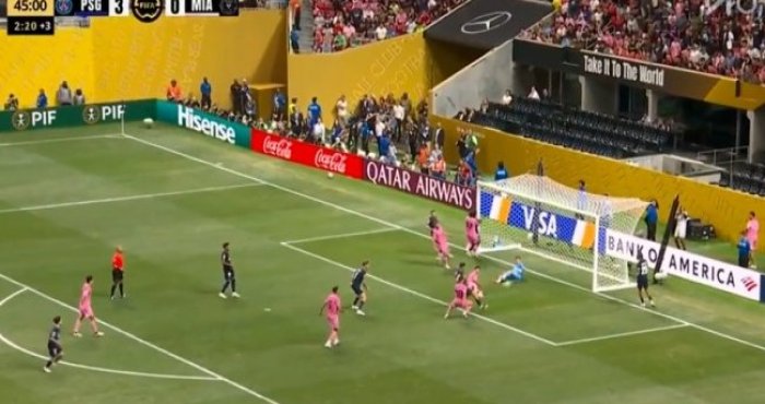杜埃造阿維萊斯烏龍!第45分鐘,杜埃右路下底傳中,皮球打在阿維萊斯身上折射,隨后飛進自家大門,巴黎圣日耳曼3-0邁阿密國際!↓
