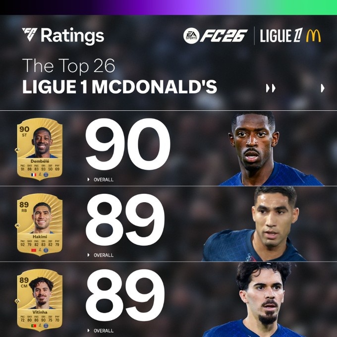 FC26官方法甲球員評分榜:登貝萊90最高,阿什拉夫和維蒂尼亞89