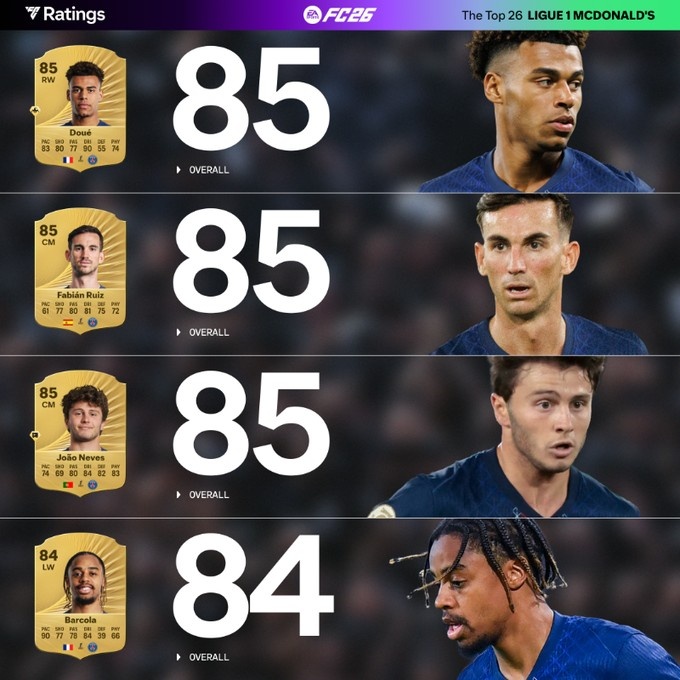 9月13日訊 FC26公布了法甲球員評分榜,其中登貝萊居首,具體如下: