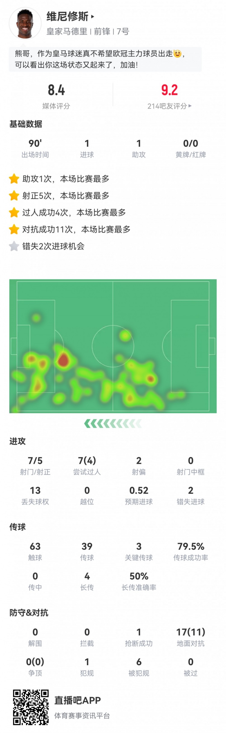 維尼修斯數據:7射5正傳射建功!3次關鍵傳球2次錯失進球評分8.4