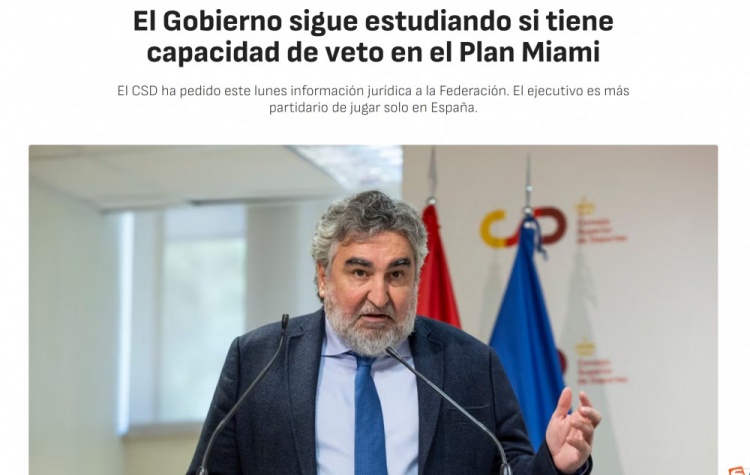 通過這一行動,西班牙高等體育委員會繼續(xù)研究自身是否對該項目擁有否決權(quán)。盡管最初幾乎所有相關(guān)方都認(rèn)為此事超出政府職權(quán)范圍,因為一般認(rèn)為政府僅需批準(zhǔn)在西班牙境內(nèi)舉行的國際賽事,例如2030年世界杯、歐冠決賽等。但現(xiàn)在情況不再明確,政府正在研究是否最終擁有決定權(quán)。