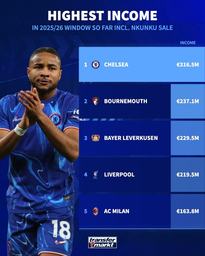 08月28日訊 據(jù)多家媒體消息,恩昆庫即將以超過4000萬歐元轉(zhuǎn)會(huì)費(fèi)加盟米蘭,據(jù)德轉(zhuǎn)統(tǒng)計(jì),切爾西今夏賣人總收入將達(dá)到3.165億歐元,冠絕全歐,比賣人榜第二位的伯恩茅斯多了近8000萬歐元。