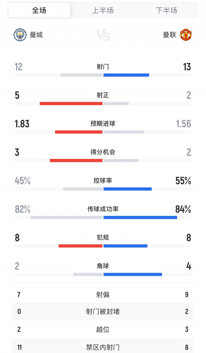 曼城vs曼聯(lián)全場數(shù)據(jù):曼城12射5正進(jìn)3球,曼聯(lián)13射2正0進(jìn)球