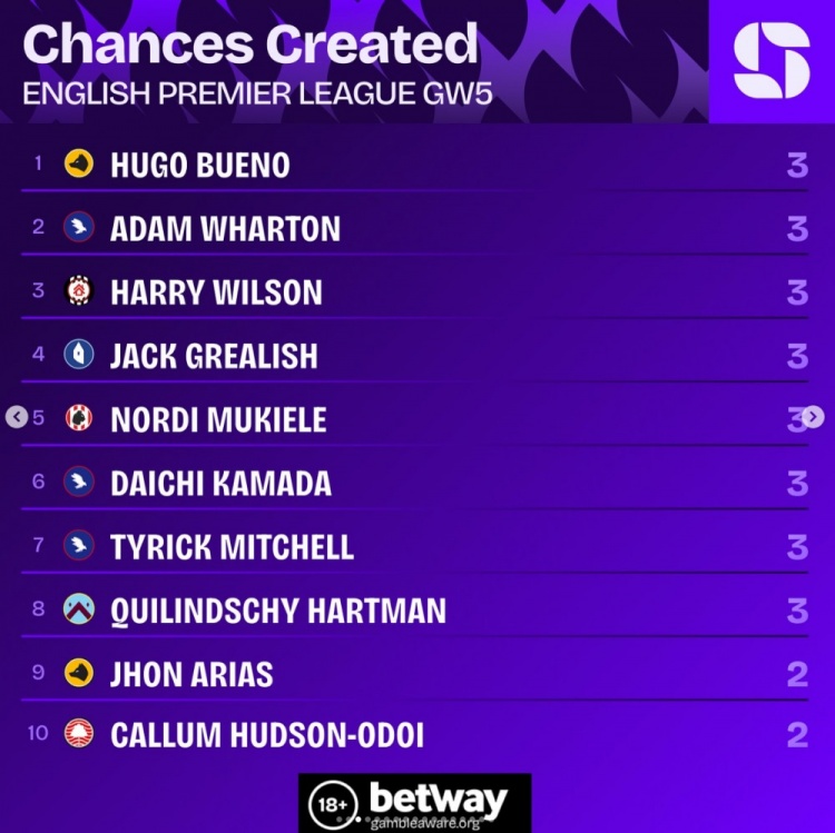 英超第5輪創(chuàng)造機(jī)會(huì)榜: