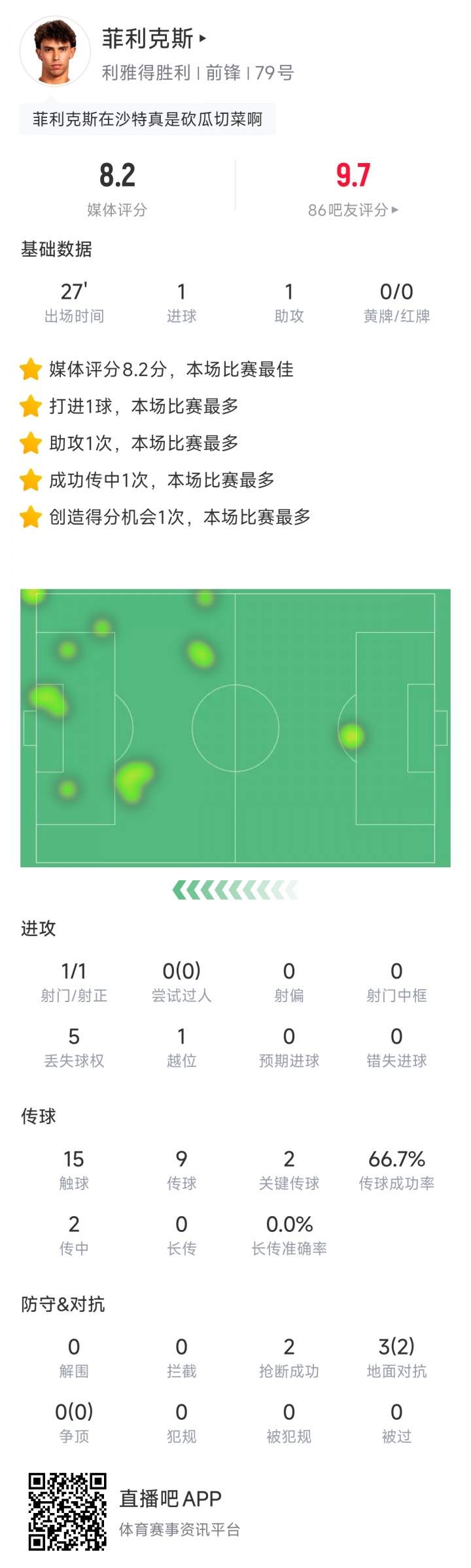 加盟沙特利雅得勝利之后,25歲的菲利克斯至今各項賽事為球隊出戰(zhàn)7場,斬獲7球2助,多次當選MVP。本場比賽菲利克斯的進球來自自己策動,然后突破,最后接隊友傳球完成終結,堪稱“降維打擊”。賽后的評分,出戰(zhàn)不到半小時的菲利克斯全場最高。