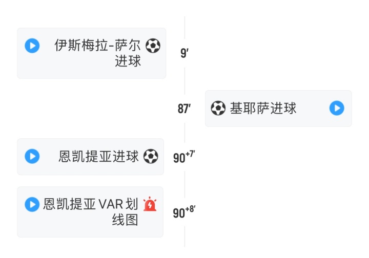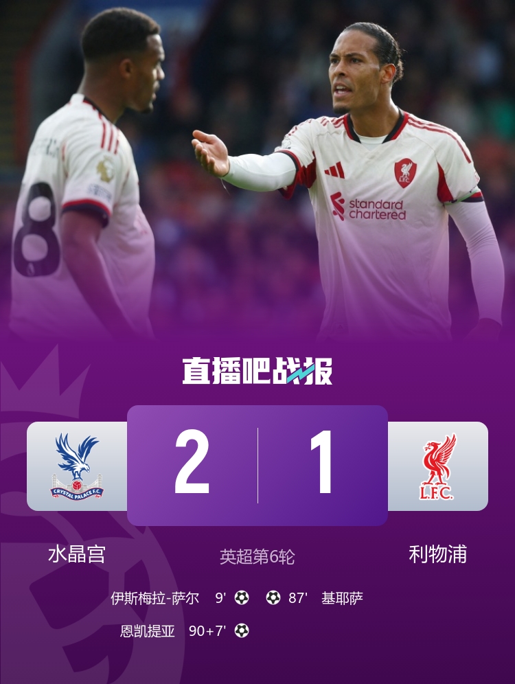 水晶宮2-1利物浦,第87分鐘基耶薩進(jìn)球,第97分鐘恩凱提亞進(jìn)球↓