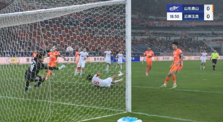 比賽第18分鐘,玉昆邊路起球傳中,葉楚貴近距離頭球攻門被王大雷擋出。