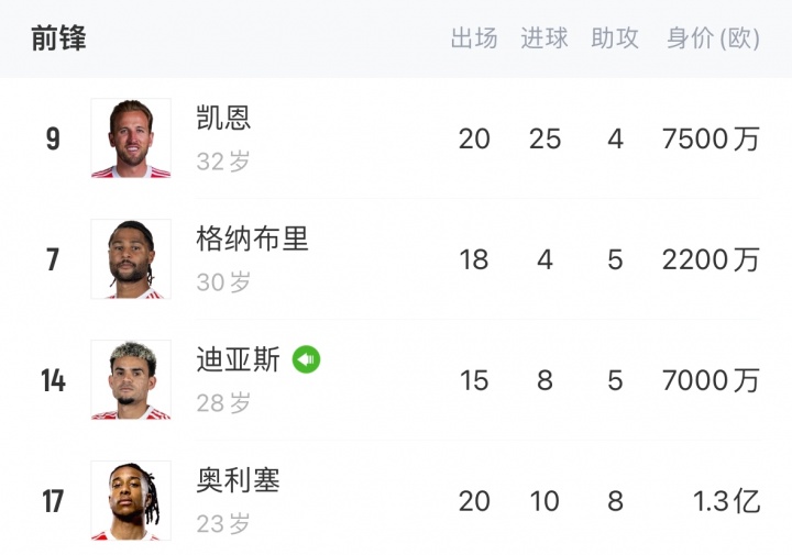 凱恩、迪亞斯、奧利塞本賽季數(shù)據(jù)↓