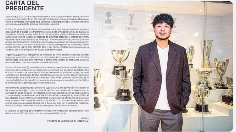 瓦倫西亞俱樂部主席Kiat Lim(林榮福兒子 )在即將召開的股東大會(huì)前,向俱樂部股東們發(fā)布了一封包含在非經(jīng)濟(jì)管理報(bào)告中的信。在這封信中,Kiat Lim談到了俱樂部和球迷在DANA災(zāi)害期間展現(xiàn)的團(tuán)結(jié)精神,以及搬遷至新梅斯塔利亞球場對(duì)未來的重要性。