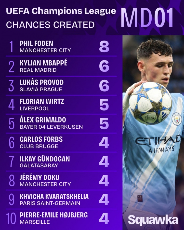 歐冠首輪創(chuàng)造機(jī)會榜:福登8次領(lǐng)跑,姆巴佩6次、維爾茨5次